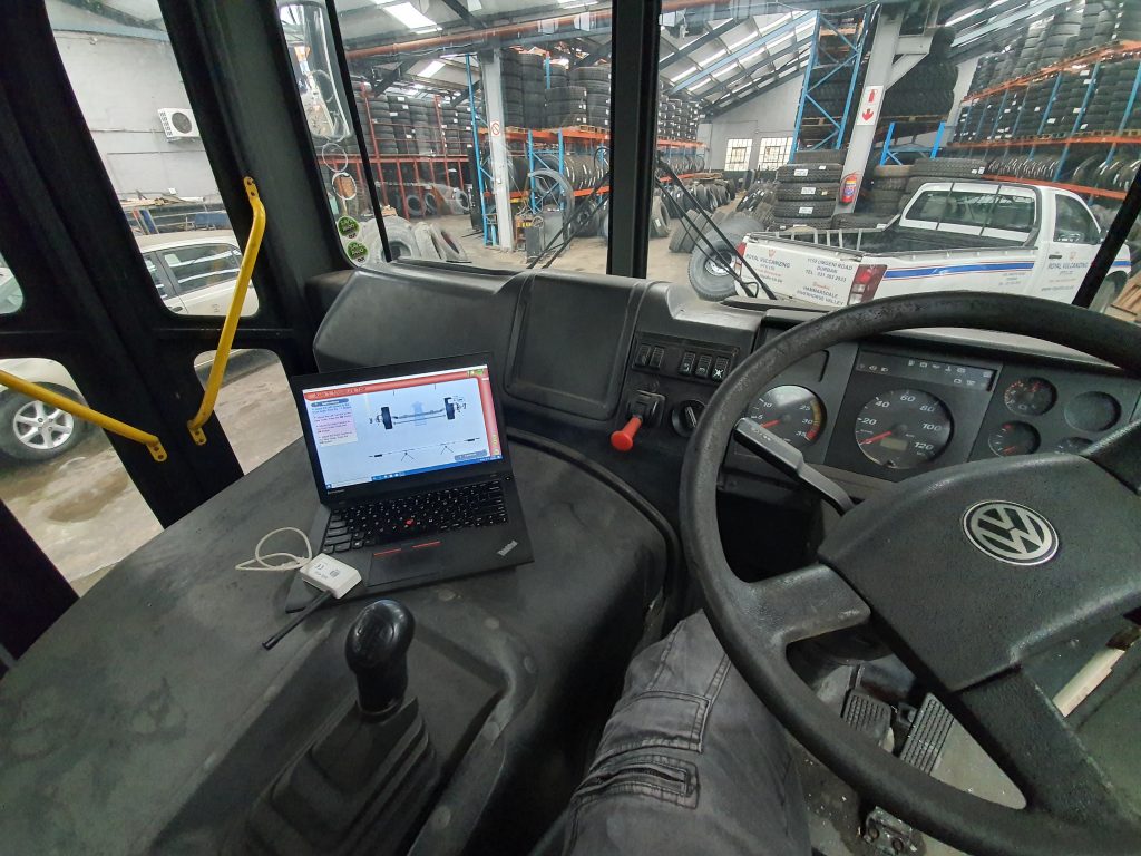 Commercial vehicles reference the chassis or sub-frame. AfriXpress-align systems mounts directly onto each tyre providing proof of vehicle dimensions for before and after using a 360 rotating measuring head (on a truck/bus). The front wheels are then set precisely in the straight-ahead position using this reference. In car alignment, wheel toe on one axle is compared to the wheels on the other axle. This system works perfectly for cars but is not correct for trucks and buses.